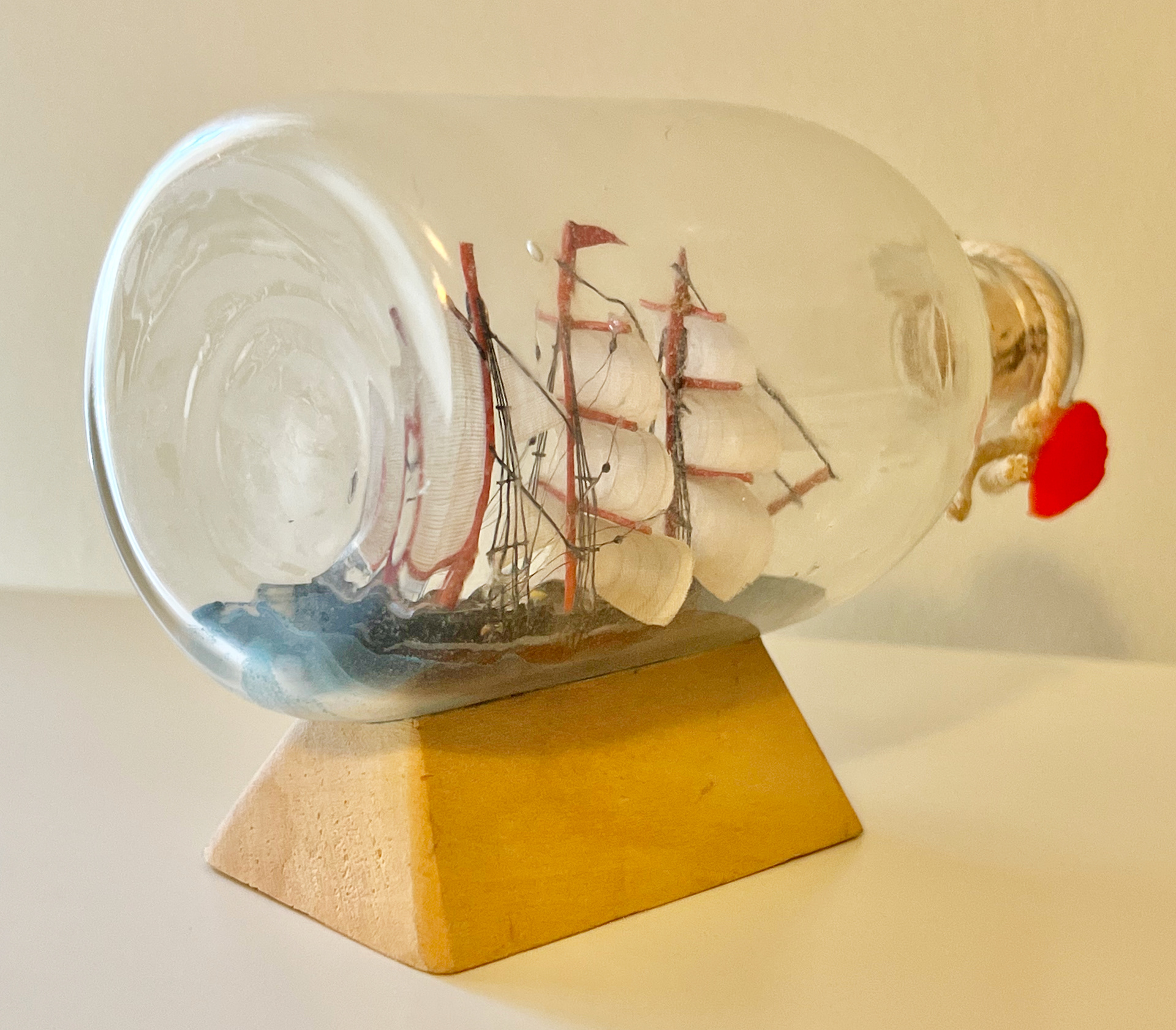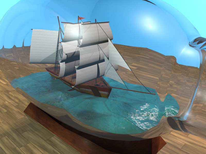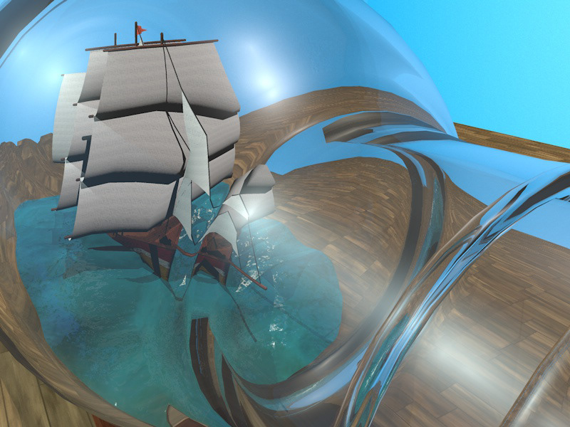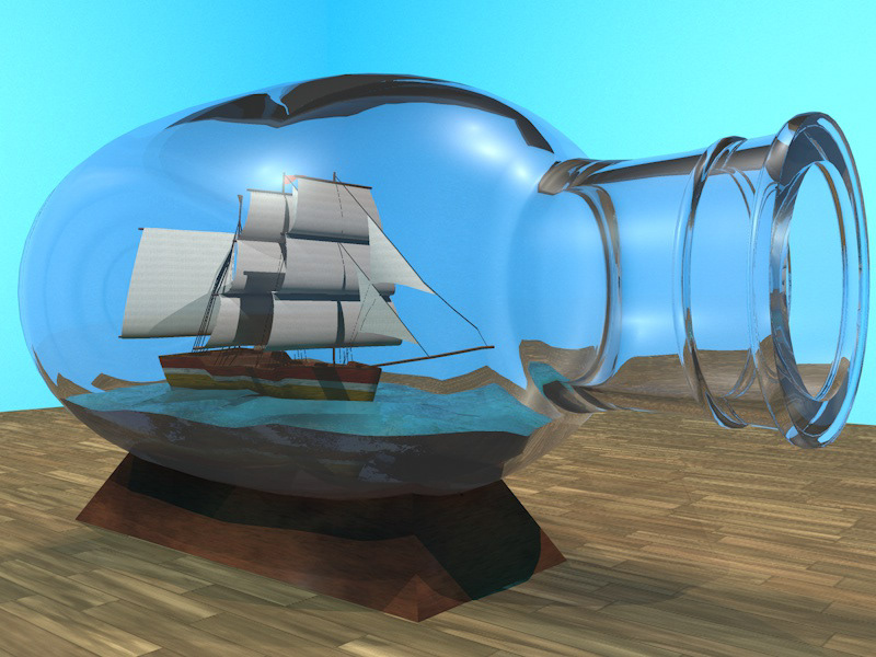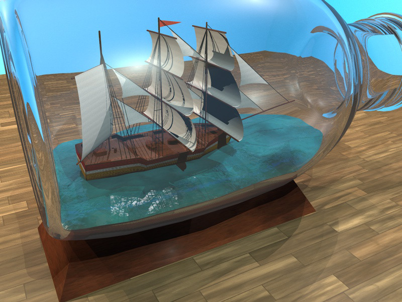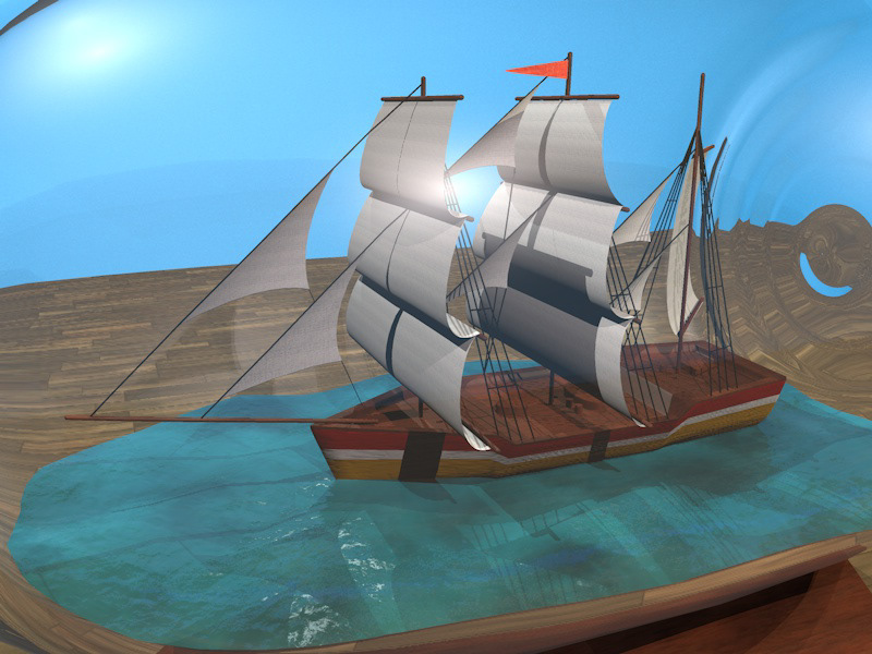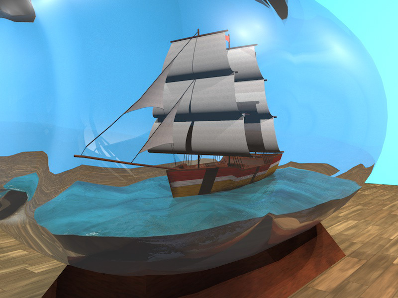 This 3D computer model, made in Cinema 4D, replicates a thrifted ship in a bottle figurine. Everything from the ships sails and paint job to the glass bottle refractions are modeled after the real life model.