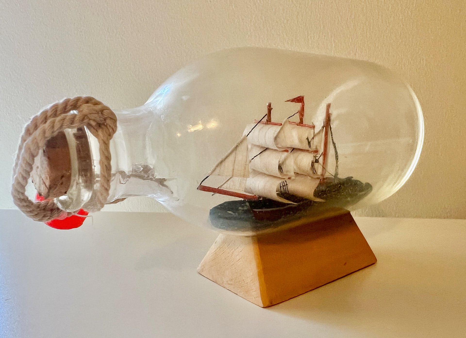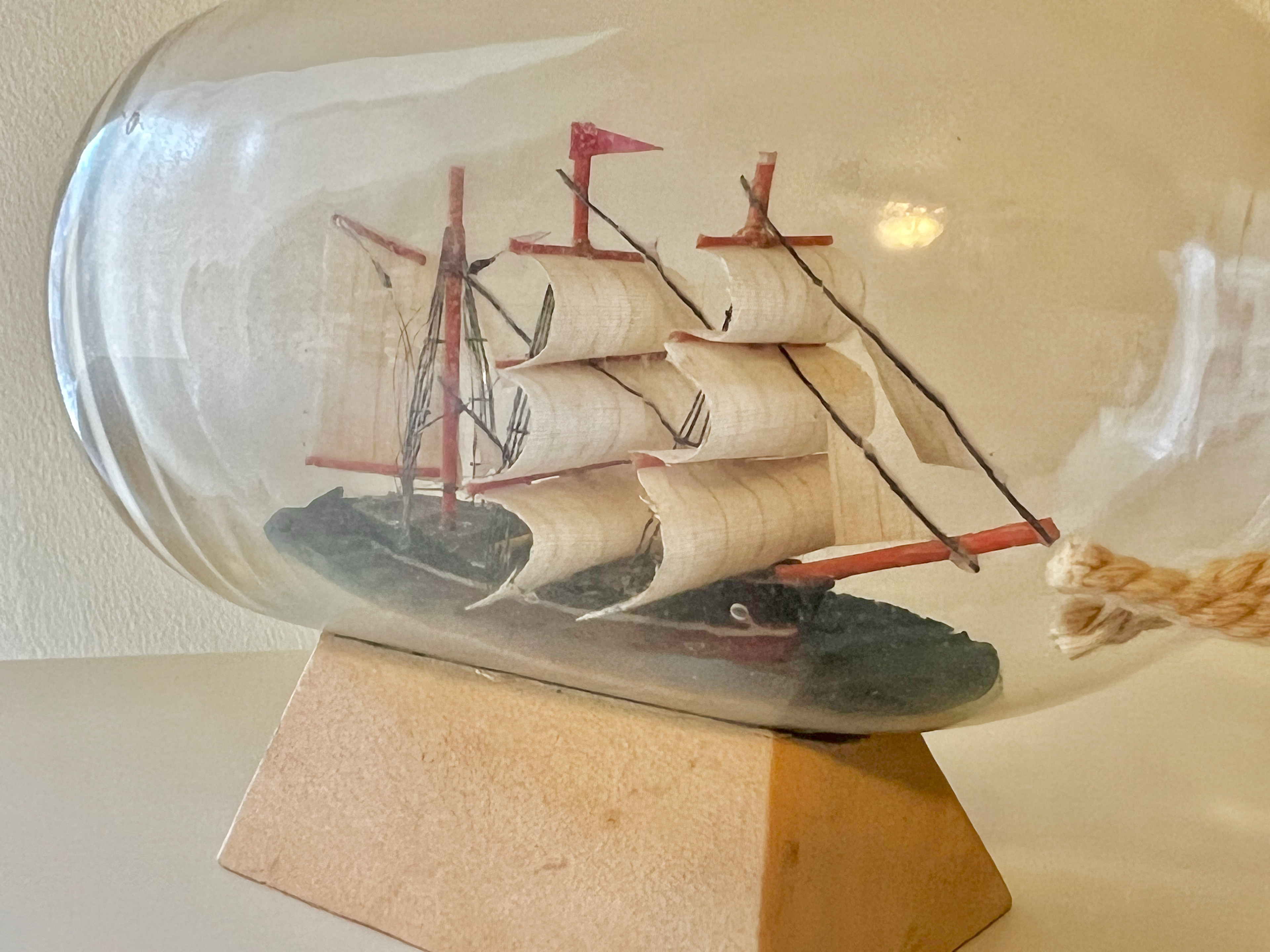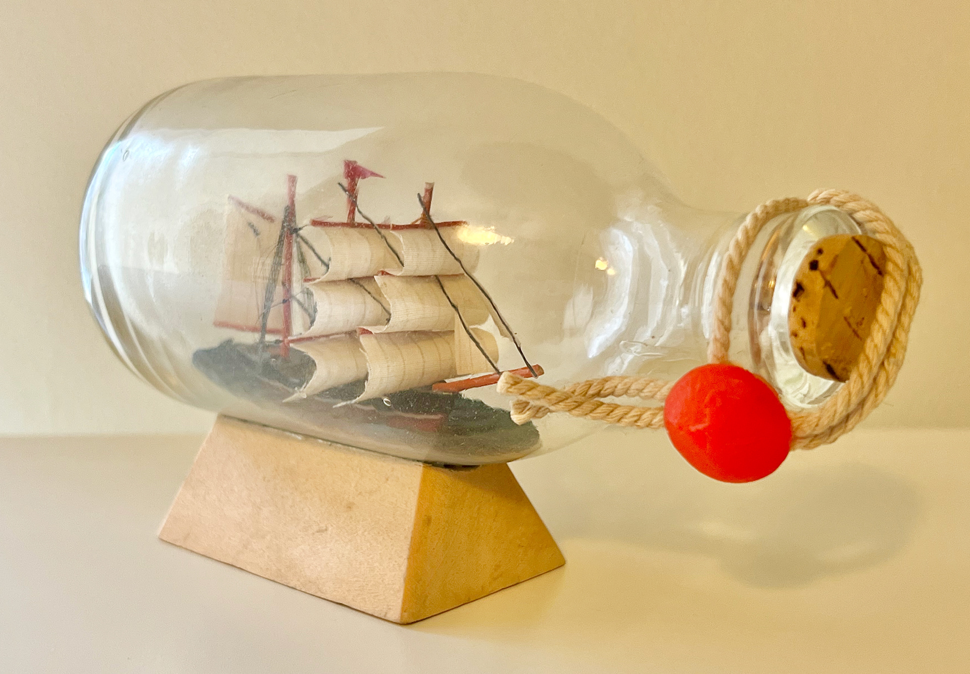 This 3D computer model, made in Cinema 4D, replicates a thrifted ship in a bottle figurine. Everything from the ships sails and paint job to the glass bottle refractions are modeled after the real life model.