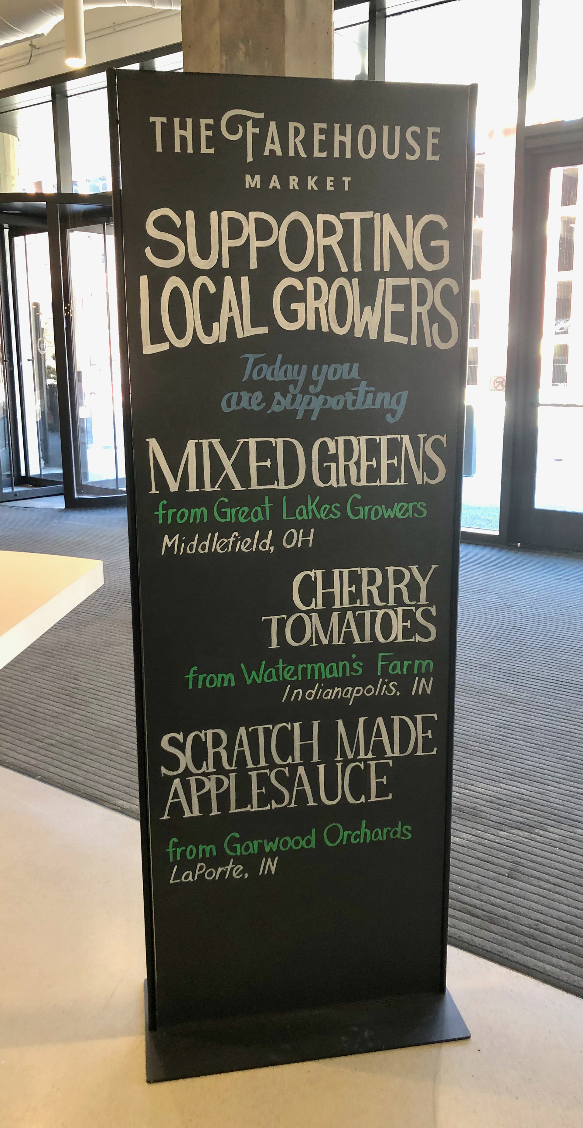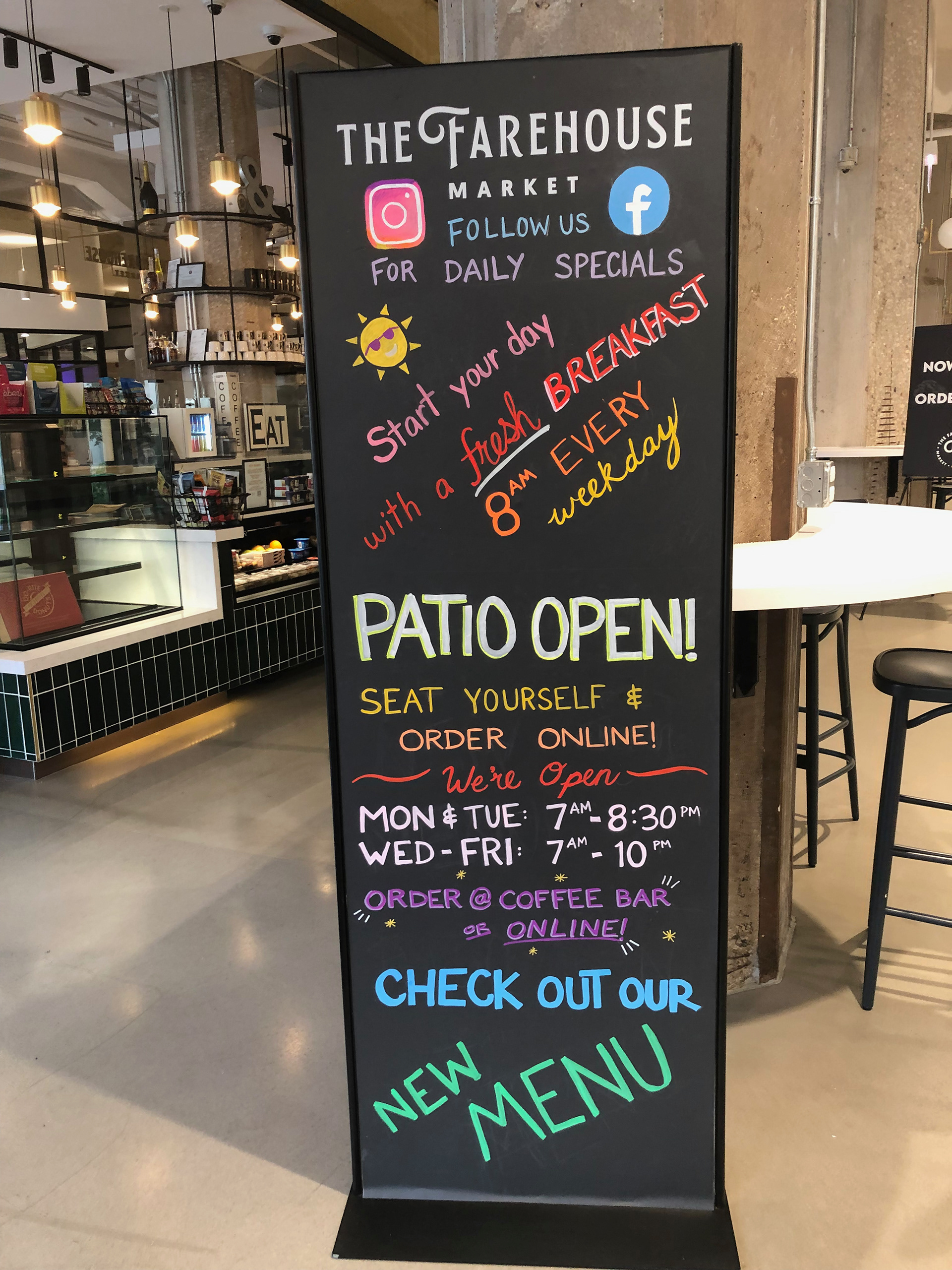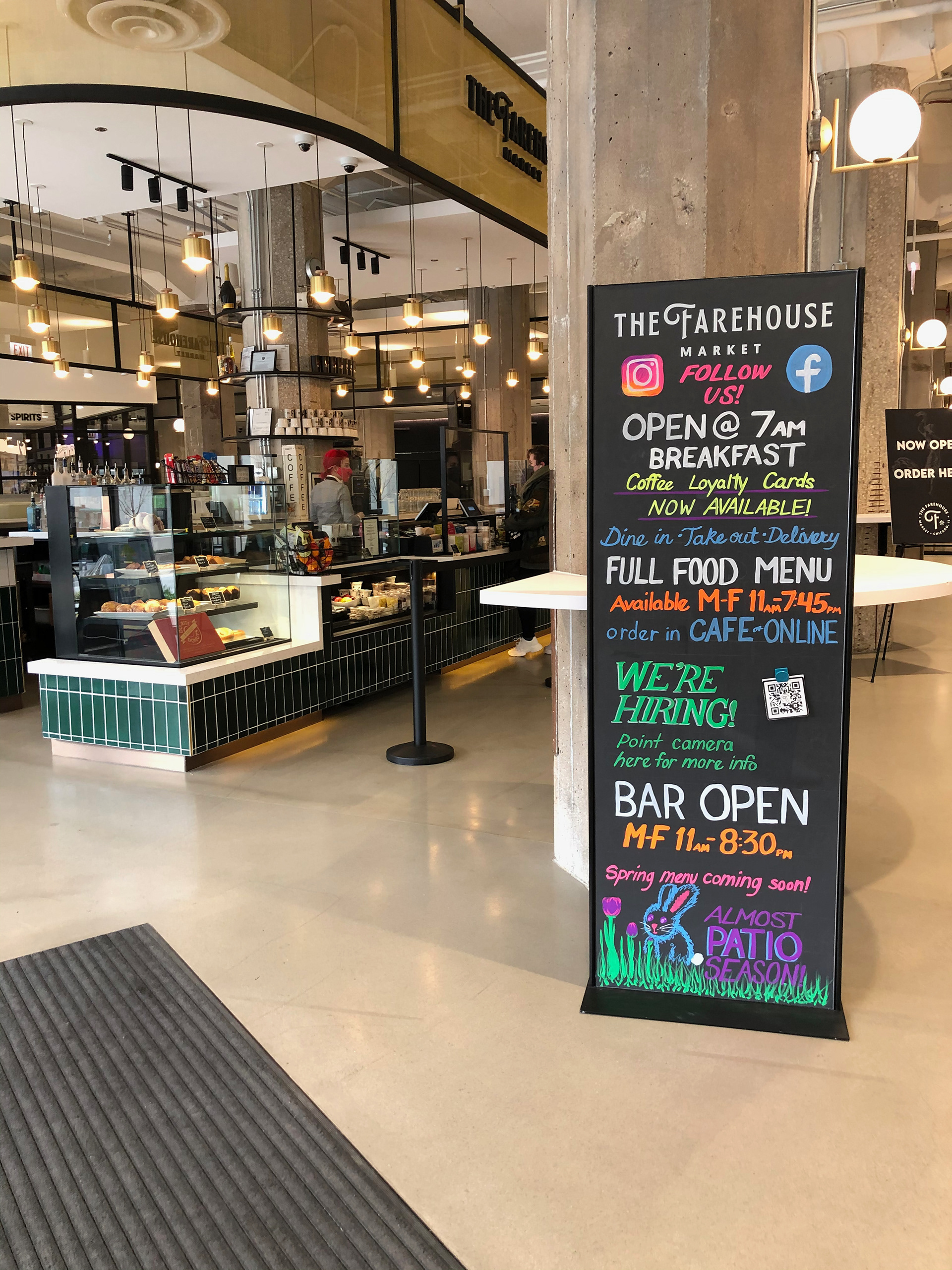 The Farehouse Market food hall in the 600 W Chicago building, included several areas where they needed quick hand to create custom announcements in their servery—on both chalkboard panels and glass sneeze guards.